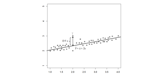 이 때, 재방문의향 Y와 직원 서비스 만족도 의 관계를 나타내는 회귀선을 어떻게 구할 것인가가 문제될 것입니다. 회귀선을 구하는 방법은 실제 Y값과 회귀선을 통해 추정한 값 (Y hat)의 차이 즉 잔차 e==a+bx의 제곱합을 최소화하도록 a와 b를 추정하는 것입니다. a와 b는 α와 β의 추정량이다. a와 b는 표본을 통해 얻어지는 추정량이라는 뜻에서 소문자로 표기하였다. 이렇게 자료에서 회귀식으로 설명하지 못하는 잔차항의 제곱합이 최소가 되도록 회귀계수의 값을 추정하는 방법을 최소자승추정법이라고 합니다.