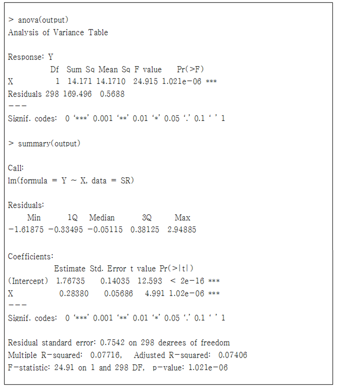 R에서 단순선형회귀분석을 실행하기 위해서는 lm(종속변수~독립변수,data= 분석 대상 데이터) 형식으로 명령어를 실행하면 됩니다. 키와 몸무게의 관계와 같이 절편항이 없는 회귀식이 있을 수 있습니다. 이럴 때에는 lim(Y~X-1,data=SR) 형태로 명령어를 변경해 주면 됩니다. R에서 분산분석을 실행하는 명령어는 aov(종속변수~독립변수, data=분석 대상 데이터)였는데 독립변수와 종속변수의 형태만 정확하게 입력했다면 분산분석에서도 lm 명령을 활용할 수 있습니다.