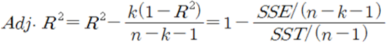 R에서 실행한 단순선형회귀분석의 결과에서 Multiple R-squared는 회귀분석모형이 자료를 얼마나 잘 설명하는지를 나타내는 결정계수입니다. 결정계수는 회귀분석을 통해 얻은 Y의 추정값과 Y의 평균값의 차이를 제곱하여 더한 SSR(regression sum of square)을 실제 Y 값과 Y의 평균값의 차이를 제곱하여 더한 SST(total sum of square)로 나눈 값입니다. 실제 Y값과 Y의 평균값의 차이 중에서 회귀식이 설명하는 부분이 커지면 SSR 역시 커질 것이므로 결정계수 역시 큰 값을 가지게 됩니다. 결정계수는 독립변수가 증가하면 할수록 실제 설명력과는 무관하게 증가하는 문제를 갖고 있습니다. 이러한 문제를 해결하기 위해 자유도를 반영하여 독립변수가 증가하여 자유도가 증가하는 만큼 설명력이 증가하지 못하면 수치가 감소하도록 보정한 것이 수정결정계수(adjusted R-squared)입니다. 아래 수정결정계수 산출식에서 n은 표본크기, k는 독립변수의 개수입니다.