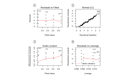 자료가 회귀분석에 산정하는 가정에 부합하는지 여부를 검토하는 방법을 알아보았으므로 다음 포스팅에서는 자료가 가정을 만족시키지 못할 경우 필요한 조치에 대해 살펴보고자 한다.