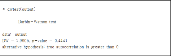 오차항의 자기 회귀 현상을 점검하기 위해 사용하는 가장 일반적인 방법으로는 Durbin-Watson 검정이 있다. Durbin-Watson 검정은 회귀분석모형에 상수항이 포함되어 있고 독립변수가 비확률변수이며 독립변수에 시차변수가 포함되지 않을 때 적용할 수 있는 검정 절차이다. Durbin-Watson 통계량은 인접한 잔차항들 간의 차이의 제곱합을 잔차의 제곱합으로 나눈 값인데 잔차들 간에 자기 회귀 현상이 없다면 Durbin-Watson 통계량은 2에 가까운 값을 갖게 된다. 사례에서 Durbin-Watson 검정을 실시한 결과 오차항들간의 자기회귀현상은 없는 것으로 판단할 수 있을 것 같다.