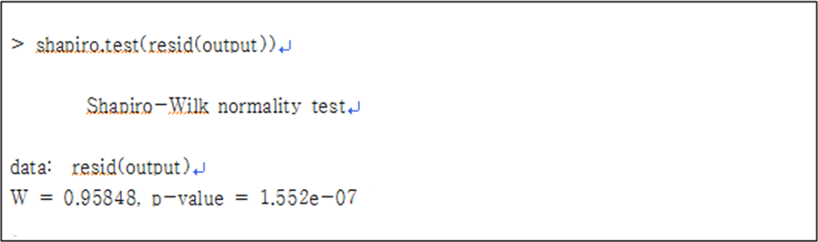② 두 번째 산점도는 잔차항이 정규분포를 알아보기 위한 차트로 이론적인 정규분포 값과 잔차항을 잔차의 표준편차로 나눈 값이 직선의 형태에 부합하면 오차항이 정규분포를 따른다고 볼 수 있다. 만약 명확하지 않다면 정규성 검정절차를 거쳐 확인합니다. Shapiro 정규성 검정을 실시해 본 결과, 사례에서의 잔차항은 정규분포를 따른 것으로 볼 수 있다.