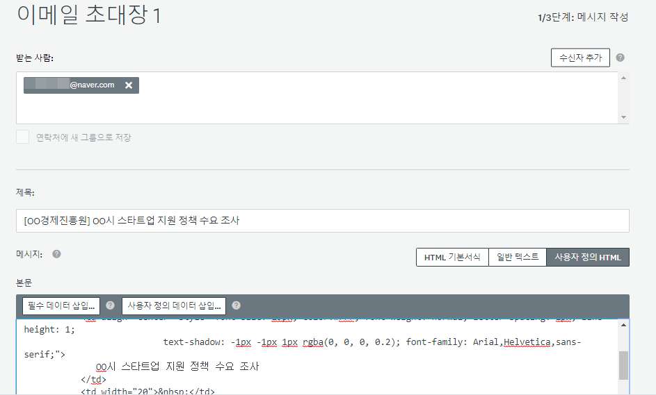 이메일 초대장 메시지의 사용자정의HTML 모드를 활성화한 후에는 원하는 위치에 협조 공문 이미지 링크의 HTML 코드를 삽입하고 저장한 후 다음 단계로 진행하면 됩니다.