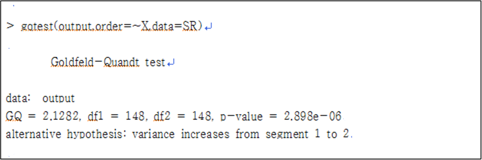 사례에서 오차항이 일정한 분산을 가진다는 등분산 가정을 좀 더 정확하게 점검하기 위해 Goldfeld-Quandt 검정을 실시해 보았다. Goldfeld-Quandt 검정은 잔차의 이분산성이 독립변수의 값과 직접 관련이 있다는 가정 하에 잔차 분산이 큰 집단과 그렇지 않은 집단을 나누어 이분산성을 검증하는 방법이다. 검정 결과 오차항의 분산은 다른지 않은 것으로 볼 수 있다. Goldfeld-Quandt 검정을 R에서 사용하기 위해서는 lmtest라는 패키지를 설치해야 하고 설치를 위해서는 관리자 권한으로 R 프로그램을 실행해야 한다.