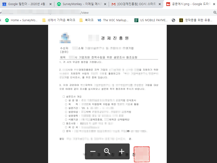 그런데 일반적으로 이러한 유형의 조사에서는 조사 대상자들이 관련 기관의 협조 공문을 요구하는 경우가 많습니다. 이 경우 조사 대상자가 이메일을 클릭하여 처음으로 보게 되는 서베이몽키 이메일 초대장의 메시지에서 설문 참여 버튼과 함께 공문을 확인할 수 있다면 조사의 응답률을 높일 수 있습니다. 하지만 서베이몽키 디자인과는 달리 이메일 초대장의 메시지에서는 별도로 이미지를 삽입하는 기능을 제공하고 있지 않으므로 협조 공문을 노출하기 어렵습니다.