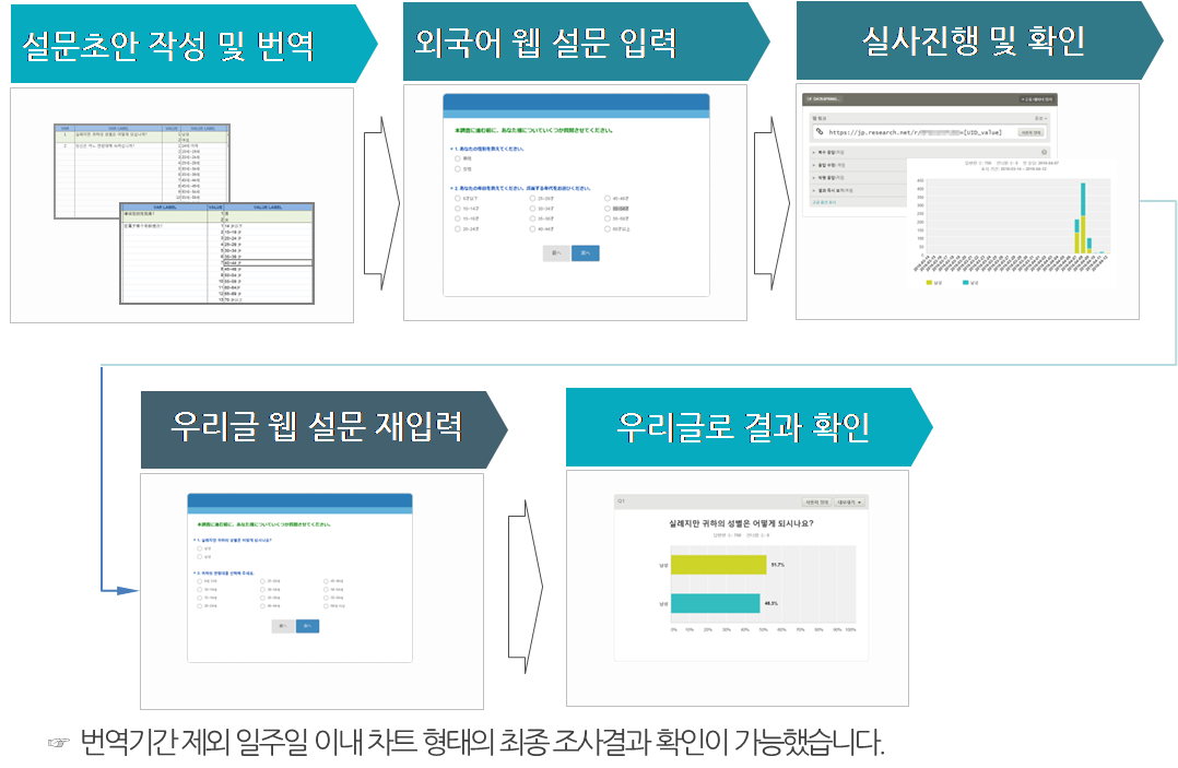 긴급한 해외 소비자 조사라면 설문 작성 및 번역 기간을 제외하고 일주일 이내에 차트 형태의 결과를 확인할 수 있습니다. 실시간으로 차트 형태의 결과를 확인할 수 있고 최종 결과 데이터는 우리글로 된 웹 설문과 연결하여 우리글로 된 차트 결과를 파워포인트와 엑셀 형태로 받아 볼 수 있습니다.