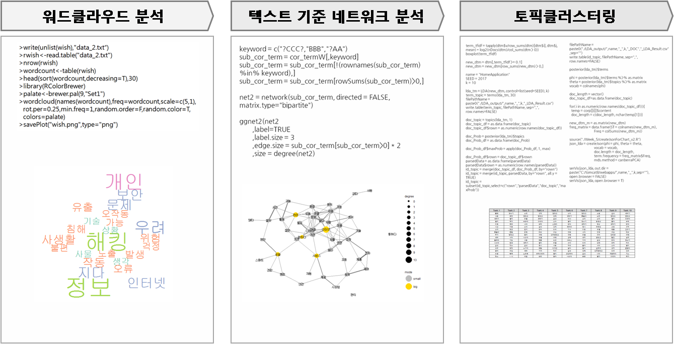 R을 이용하면 텍스트 형태의 데이터에서 키워드를 추출해 클라우드 형태로 제시할 수 있을 뿐만 아니라 키워드 간의 거리를 기준으로 상관관계를 점검해 키워드 간의 네트워크를 그려 볼 수 있습니다.