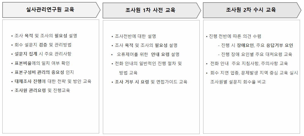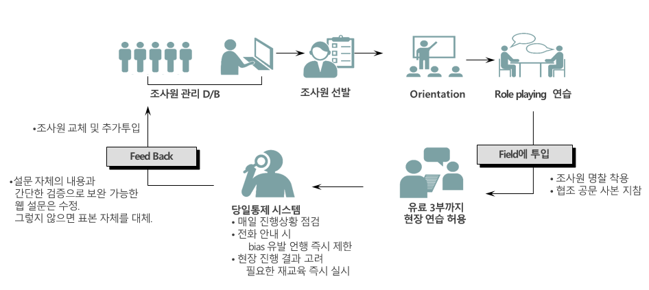 풍부한 조사원 인력 자원을 기반으로 우수한 면접원을 선발하여 철저한 교육을 제공하고 자료수집 기간 중 엄격한 조사원 관리를 통해 조사 품질을 유지하고 있습니다.