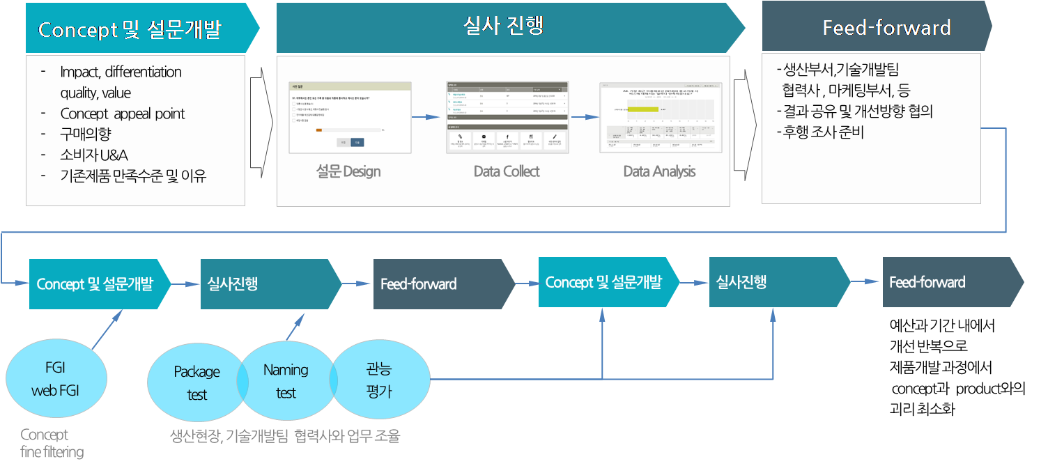 사업 기획이나 제품 기획 과정에서 중요한 쟁점을 보다 더 깊이 있게 파악하기 위해 필요한 분석만을 선별해 적용할 수있습니다. 상대적으로 중요하지 않은 내용은 실시간으로 바로 바로 확인하고 가격이나 KBB등 심층적인 분석이 필요한 사항에 대해서는 집중적인 데이터 분석 작업을 통해 의사결에 필요한 정보를 얻을 수 있습니다. 미주 지역 소비자 대상 신제품 수용도 조사에서 설문 기획 및  실사진행 서비스만 제공하고 제품에 대한 수용도는 실시간 결과 공유를 통해 확인한 후 가격 등 쟁점 사항에 대해 집중적으로 분석한 사례가 있습니다.