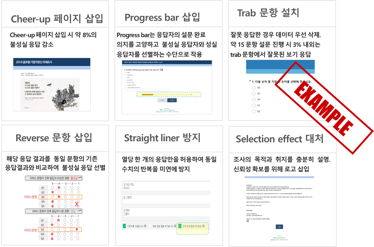 신규 패널 대상 tutorial survey를 실시하여 설문 응답 시 주의 사항에 대한 교육을 실시하고 있으며, 조사 진행 시에는 새로 고침 금지, 중복참여 금지, 불성실 응답 기준을 안내하고있습니다. 그 외 정기적인 홍보 캠페인을 통해 지속적으로 성실응답을 독려하고 있으며 패널 활동 이력 및 응답 데이터 검수를 통해 삼진 아웃제를 운영하여 3회 이상 불성실 응답 시 패널 탈퇴 조치를 하고 있습니다.