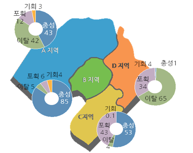 B 지역은 충성 고객의 비중이 높아 고객 유지가 주요 과제인 반면, 이탈 고객과 포획 고객의 비중이 높은 A, C, D 지역은 고객 이탈을 방지하기 위한 대책 마련이 시급한 상황입니다. 특이 이탈 고객의 비중이 높은 A 지역과 D 지역이 특히 문제가 될 것입니다.
