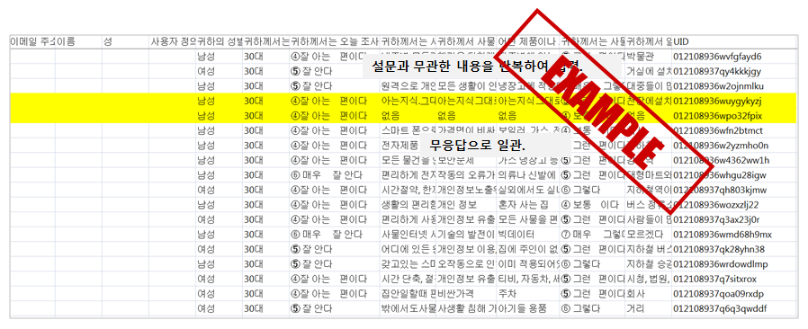 실사 관리 연구원과 에디팅 요원이 raw data의 주관식 문항과 기타 오픈 문항, 인구통계 문항 등에서 불성실 응답을 점검하여 통계분석팀 및 연구원과 공유함으로써 일차적으로 데이터의 품질을 관리합니다.