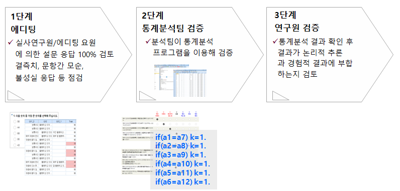 실사 관리 연구원과 에디팅 요원이 raw data의 주관식 문항과 기타 오픈 문항, 인구통계 문항 등에서 불성실 응답을 점검하여 통계분석팀 및 연구원과 공유함으로써 일차적으로 데이터의 품질을 관리합니다.