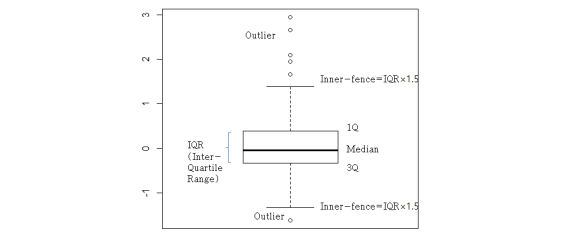 위의 회귀분석 결과의 요약에서 residual은 잔차를 의미합니다. min은 전체 자료에서 가장 작은 값, max는 가장 큰 값을 말합니다. median은 자료를 크기 순으로 배열했을 때 중간에 위치한 값입니다. 그 외 1Q는 제1사분위수(first quartile)- 자신보다 작은 값들이 전체 자료에서 차지하는 비율이 25%인 값을 말하고 3Q는 제3사분위수(third quartile)-자신 보다 작은 값들이 전체 자료에서 차지하는 비율이 75%인 값입니다. 이들 min, max, median, 1Q,3Q를 보는 이유는 이들 다섯 가지 수치를 보면 분포의 형태를 짐작할 수 있기 때문입니다. 이들 다섯 가지 수치를 포함하여 boxplot을 그려보면 아래와 같습니다. 다소 비대칭인 모습을 보여 좀 더 살펴볼 필요가 있어 보입니다.