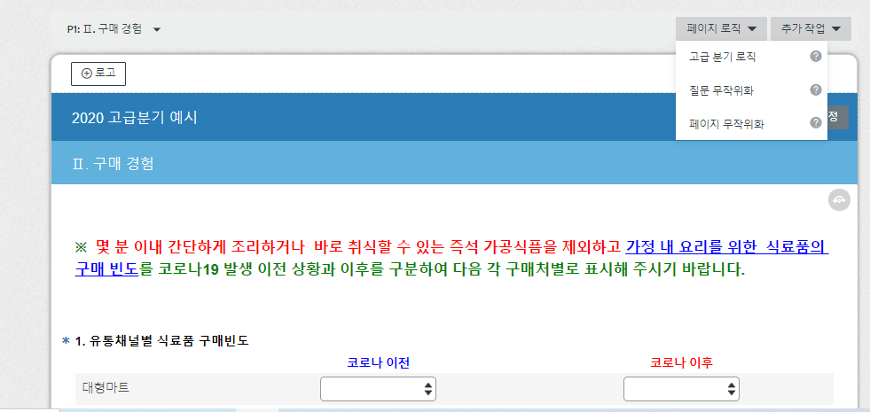 드롭다운 메뉴 행렬을 완성한 후에는 해당 페이지 상단의 페이지 로직에서 고급 분기 로직에서 원하는 규칙을 입력합니다. 동네슈퍼에 대해서 코로나 전후로 필요한 조건을 선택하고 조건을 충족할 경우 이동할 페이지도 선택해 줍니다.