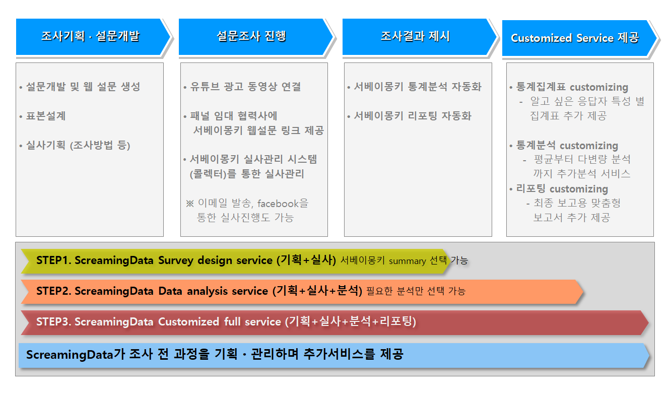 | 스크리밍데이타 주식회사는 2013년 서베이몽키 마케팅 에이전시로 출발해 엄격한 실사품질관리와 집요한 분석으로 제품과 서비스를 시장으로 이어주는 정보를 고객사에게 제공해오고 있습니다. 조사기획과 실사관리부터 최종 보고서까지 필요한 시장조사 서비스만 선별해 경제적인 비용으로 이용할 수 있으며, 마케팅 활동의 출발점이 되는 시장조사 역량을 내재화할 수 있는 지원을 받을 수 있습니다. |